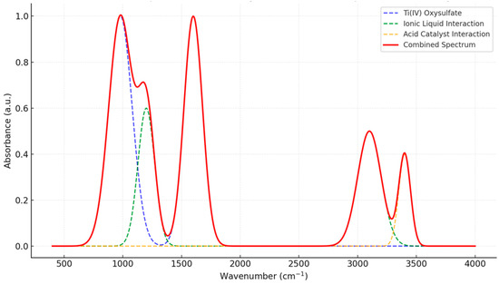 Fourier-transform infrared (FTIR) spectroscopy was utilized to investigate the interactions among Ti(IV) oxysulfate, ionic liquids, and an acid catalyst, revealing distinct absorption bands indicative of chemical and physical interactions. The Ti(IV) oxysulfate contribution is evident from strong absorption peaks near 980 cm−1, corresponding to Ti–O stretching vibrations, and at ~1600 cm−1, attributed to O–H bending modes. These features highlight the characteristic structural motifs of Ti(IV) oxysulfate see Figure 6. The ionic liquid introduces new vibrational bands, including peaks around 1200 cm−1, which can be assigned to C–N or C–O stretching modes, and a band near 3100 cm−1, corresponding to C–H stretching vibrations, likely arising from the alkyl chains or imidazolium cations of the ionic liquid. The acid catalyst contributes a broad absorption band centered at ~3400 cm−1, associated with O–H stretching vibrations, indicative of hydrogen-bonding interactions or hydroxyl groups.