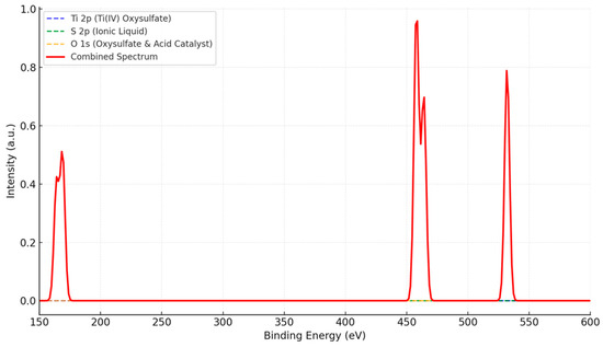The XPS spectrum reveals Ti 2p peaks (~458 and 464 eV), confirming the presence of Ti(IV). The S 2p peaks (~164–169 eV) and O 1s peak (~532 eV) reflect contributions from the ionic liquid and oxysulfate. No unexpected shifts or additional peaks that would indicate decomposition or side reactions occurred. The system’s chemical states remained stable and consistent.