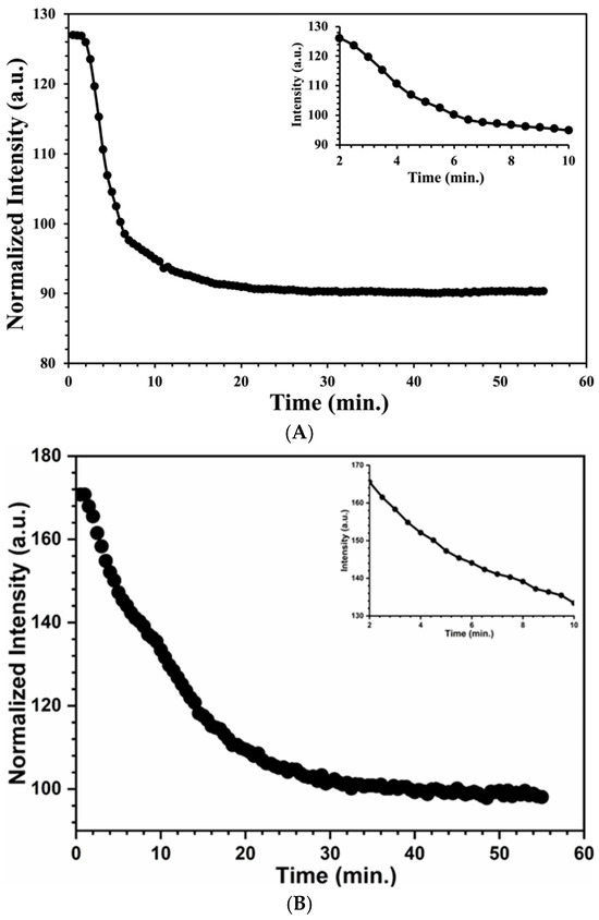 (A) Intensity versus exposure time for a cellulose test strip; the insert shows a blowup of the region of rapid decrease in intensity between 2 and 10 min; (B) the intensity versus exposure time for a silica test strip—with acid; the insert shows a blowup of the region of rapid decrease in intensity between 2 and 10 min.