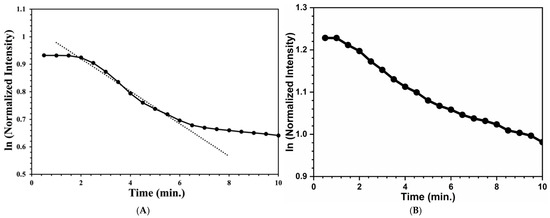A first-order kinetic behavior was chosen over other orders, as it is the simplest form that describes the experimental data and allows for a comparison with previous data. By using the rate constant equation and from the plot, a negative slope was obtained from Figure 11. In addition, the linear regression of the plots was measured. When saturation occurred, the reflected intensity also stopped, as there were no active titania materials that remained to interact with the peroxide vapor. It was observed that when there was a higher loading of the titania materials, this produced a smaller intensity, because more light was absorbed rather than reflected. For each experiment, the saturation intensities were monitored by measuring the average of the final five minutes of vapor exposure, and it was found that the difference was only less than 1% from the calculated previous run.