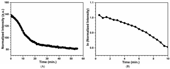 (A) Intensity versus exposure time for a silica test strip—without acid and (B) the first-order behavior of the first 10 min of exposure. The silica test strip was exposed to a peroxide concentration of 29 ppm for 1 h.