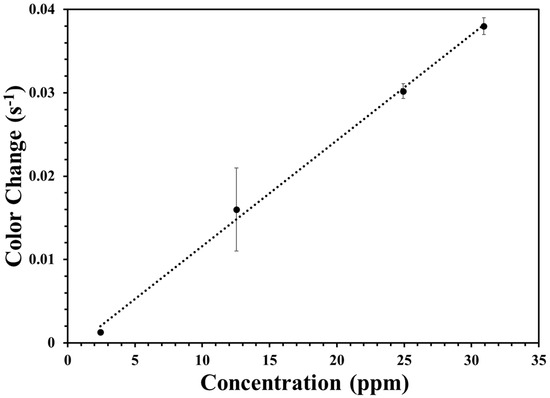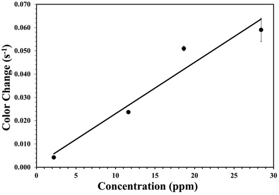 The phenomenological first-order rate constants versus measured peroxide vapor concentrations in ppm for the silica test strip with acid is shown in Figure 14. The linear regression value for the phenomenological first-order rate constants versus measured hydrogen peroxide vapor concentrations for with acid plots was obtained for the silica test strips with an R2 of 0.99. The value of the slope from Figure 14 is 1.3 ± 0.04 × 10−3, which is the color change per ppm per second. The results obtained suggest that the silica-based test strip shows approximately identical sensitivity with the cellulose-based test strip. This means that both the test strips are superior materials with almost equal sensitivity and reproducibility. The surface area and porosity of the cellulose test strip is comparatively higher than the silica test strip, and the porous nature of the test strip is not likely the cause of the different rates. The volume of the titania sample also plays a crucial role for the different rates of these thin films. Usually, when there was a higher load of titania materials, more H2O2 vapor could be captured and complexed at a certain time interval, which leads to an increased sensing efficiency. However, after the optimum loading, a further loading of titania could inhibit the porosity, resulting in a decrease in the vapor penetration. Both types of test strips were white-colored; therefore, no added background materials were needed to reflect the light. Furthermore, based on the experimental setup, there could be some differences in rates between the test strips. The control thin films with no added titania on the test strips showed no reactivity towards the peroxide vapor, which also can be referred to as the background.