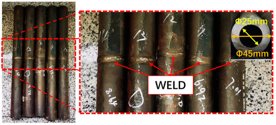 T92/Super304H dissimilar steel pipes that served 70,000 h, 80,000 h, and 85,000 h in the power plant were used in the study. As shown in Figure 1, the outer diameter of the pipe is 45 mm, the inner diameter is 25 mm, and the wall thickness is 10 mm. In the welded joint, the welding material adopts ENCrNi-3-type welding wire. The service environment of the pipeline is 650 °C.