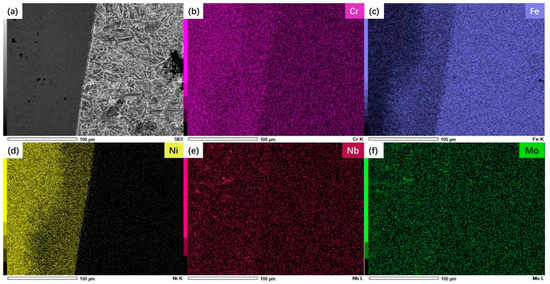 EDS analysis results of T92 steel side in welded joints: (a) Microstructure morphology; (b) Cr element distribution; (c) Fe element distribution; (d) Ni element distribution; (e) Nb element distribution; (f) Mo element distribution.