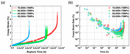 Creep curves (a) and creep strain rate curves (b) of welded joints with different service histories.