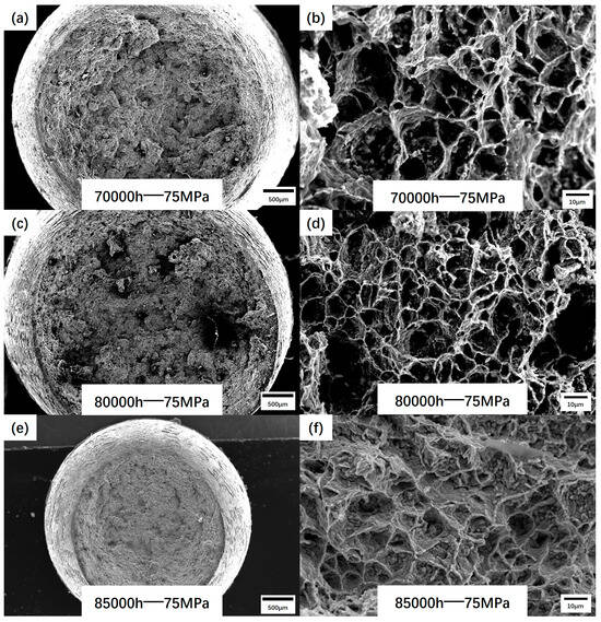 Creep fracture surface: (a,b) are the creep fracture surfaces of the 70,000 h group joint; (c,d) are the creep fracture surfaces of the 80,000 h group joint; (e,f) are the creep fractures of the 85,000 h group joint.