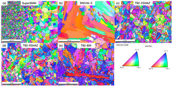 The cavity distribution has obvious regional characteristics, which is directly related to the microstructure evolution of each subzone. Figure 11 shows the inverse pole figure (IPF) of each subzone of the joint after 80,000 h of service. The figure shows the grain size characteristics and orientation characteristics of each subzone. Overall, each micro-zone of the joint maintains the grain size characteristics formed during welding, and the grain orientation does not deflect in a specific direction due to temperature or stress. It is worth noting that in the FGHAZ on the T92 steel side, the average grain size is small, and there are few martensitic laths inside the grains.