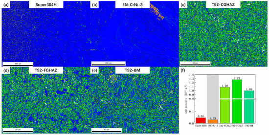 GND distribution of different subzones of welded joints in service for 80,000 h: (a) Super304H; (b) EN-CrNi-3; (c) CGHAZ on the T92 steel side; (d) FGHAZ on the T92 steel side; (e) BM on the T92 steel side; (f) The average GND density in each subzone of the joint.