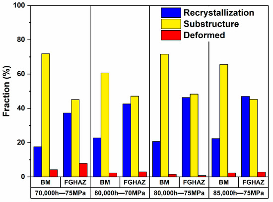 The dislocation density of the FGHAZ on the T92 side of the welded joint decreased, which is related to the recrystallization of the crystal. The grain orientation distribution diagram (GOS) can distinguish the recrystallized grains, substructure grains, and deformed grains. In Figure 14, the grain types of the BM and the FGHAZ in the four groups of specimens are analyzed. It can be seen in the figure that a large number of recrystallized grains can be observed in the FGHAZ of the four groups of specimens. The proportion of recrystallized grains is significantly higher than that of the BM of the same specimen. Taking the FGHAZ and the BM with 80,000 h of service as an example, the proportion of recrystallized grains in the BM is about 20.7%, while the proportion of recrystallized grains in the FGHAZ is 46.3%, which is more than doubled. The proportion of deformed grains is about 1%, as shown in Figure 15.