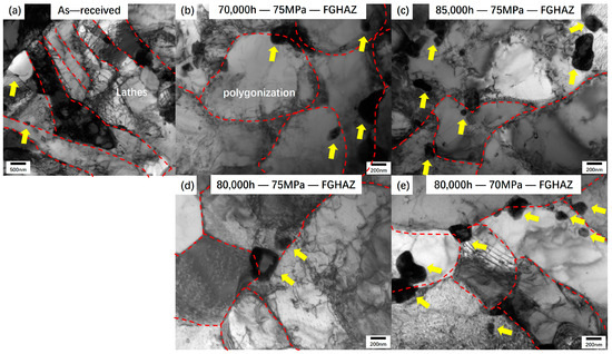 The microscopic characteristics near the fracture of the joint samples under three working conditions are shown in Figure 16. Figure 16a shows the microscopic characteristics of samples with no service history. After welding heat treatment, the characteristics of martensite laths can be observed, as shown by the red dotted line, and the laths show a slender parallel distribution. There is a dislocation network in the lath, and there is a distribution of precipitated phases at the grain boundaries. After the creep test, the martensite lath characteristics disappeared and many subgrain structures were formed. As shown in the red dotted line in Figure 16b–e, the average size of the precipitated phase increased. As shown by the yellow arrow, the size of the precipitated phase before service was less than 100 nm, while the diameter of the precipitated phase in the microstructure after creep fracture was generally greater than 200 nm, and some of the particle diameters were even greater than 300 nm. It is worth noting that under the condition of 75 MPa, the longer the use time, the larger the subgrain diameter. It is worth noting that in the microstructure after creep fracture, the number of dislocation lines in the subgrains is significantly reduced, and only a small amount of dislocation tangles can be observed at the grain boundaries and subgrain boundaries. The order of subgrain diameter of the three groups of samples is 70,000 h > 80,000 h > 85,000 h, corresponding to the creep time of the three groups of samples in Figure 8.
