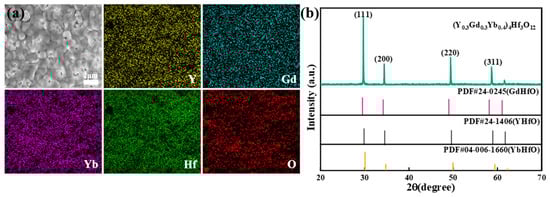 (a) SEM-EDS mapping of YGYbH; (b) XRD pattern of sintered YGYbH ceramic bulks, and standard PDF cards of Gd2Hf2O7, Y2Hf2O7 and Yb2Hf2O7.