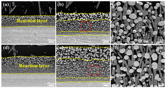 As shown in Figure 13, the reaction layer thickness at 1300 °C is overall thinner than that at 1400 °C. According to Equation (4), the viscosity of the melt decreases exponentially with the increase in temperature.