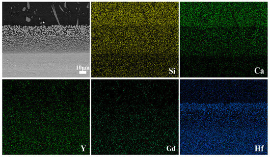 Cross-sectional morphologies of YGYbH and the EDS mapping of Si, Ca, Y, Gd, and Hf elements after CMAS melt corrosion at 1300 °C for 10 h.