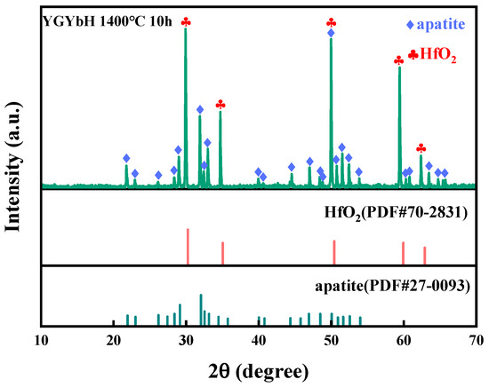 The corrosion products of YGYbH exposed to CMAS melt at 1400 °C for 10 h were analyzed, as shown in Figure 7. The corrosion products observed at 1400 °C were similar to those formed at 1300 °C, consisting of the HfO2 phase and the apatite phase Ca2RE8(SiO4)6O2. This indicates that the corrosion reaction mechanism remains unchanged despite the increase in temperature. Therefore, the CMAS corrosion behavior of YGYbH at 1400 °C can be interpreted using the results obtained at 1300 °C.