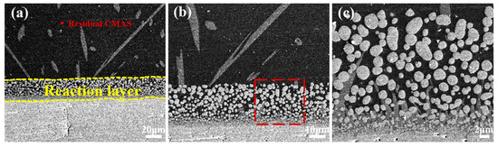 Cross-sectional morphologies of YGYbH after CMAS melt corrosion at 1400 °C for 0.5 h (a–c).