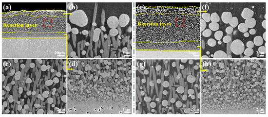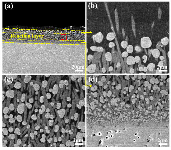 Upon further prolonging the corrosion time to 2 h, as shown in Figure 10a, the reaction layer is characterized by the three-layer structure, the thickness of which grows significantly to 70 µm, mainly due to the thickness growth of the intermediate layer. It can be seen from the magnification view in Figure 10b–d that the HfO2 phase becomes more rounded, and the bottom layer grows denser compared with that of 1 h. After being corroded by the CMAS melt for 5 h, the overall thickness of the reaction layer increases to 170 µm, maintaining the same three-layer structure observed for 1 h case at 1400 °C. As presented in Figure 10e–h, there is no significant change in the thickness of the upper and bottom layers; however, similar to the 2 h observation, the intermediate layer makes an essential contribution to the overall thickness increase.