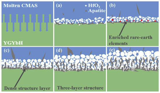 Figure 11 shows the schematic illustration of the corrosion behavior between YGYbH and CMAS melt at high temperatures. With the temperature increasing, the CMAS powder is molten and spread across the surface of the YGYbH ceramic matrix, and the corrosion reaction between the YGYbH and the CMAS melt proceeds through dissolution/re-precipitation. As the corrosion reaction processes, the corrosion product HfO2 phase gradually grows spherical, and the volume of corrosion products increases. When the HfO2 phase layer forms a certain continuity, the growth of the apatite phase towards the molten CMAS will be hindered by the continuous HfO2 phase, which causes their stacked growth at the bottom of the reaction layer. Therefore, a dense and continuous structure layer is generated to resist the penetration of CMAS melt during the stack growth. As the reaction time is further increased, a three-layer structure in Figure 11d is formed: (1) the upper layer comprising of the sparsely arranged spherical HfO2 phase; (2) the intermediate layer containing the uniformly distributed rodlike apatite phase and spherical HfO2 phase; and (3) the bottom layer with the dense structure. Furthermore, the bottom layer becomes denser with the corrosion time prolonged.