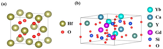 Simulated models of (a) HfO2 and (b) Ca2RE8(SiO4)6O2.