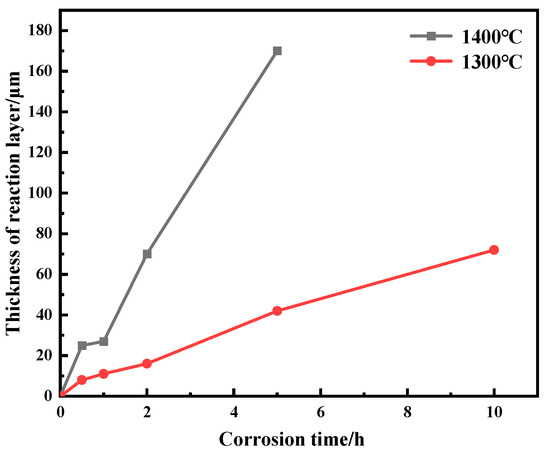 The variation curve of reaction layer thickness with corroded time at 1300 °C and 1400 °C.