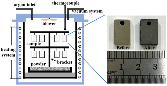 The Al powder (2N, Fushel, Changsha, China), Al2O3 powder (AR, Sinopharm Chemical Reagent Co., Ltd., Shanghai, China), and NH4Cl powder (AR, XiLong Scientific, Shantou, China) were accurately weighed in a mass ratio of 60:39:1. The ratio of the three powders was based on previous studies [19,20,22], and an initial estimation was made for the mass ratio of the three powders, which was then further refined through experiments to ensure that the desired coating quality was achieved. The three powders were put into a V-mixer (VH2, Tianhe Machinery, Shanghai, China) and mixed for 2 h to make them homogeneous to obtain the aluminizing agent. The schematic drawing of the vapor phase aluminizing furnace (VPAF1, CSU, Changsha, China) is shown in Figure 1. The samples were hung on a birdcage-type bracket by nickel wires, and the aluminizing agent was placed on the base of the bracket. Then, the furnace was pumped to vacuum and then filled with argon gas, and the operation was repeated three times to prevent the samples and the aluminizing agent from oxidation. Finally, the furnace was heated to 980 °C with a heating rate of 5 °C/min and held for 8 h. After the furnace cooled naturally to room temperature, the samples were taken out and cleaned with an alcohol solution.