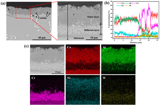 Figure 3a shows the BSE images of the cross-section of the aluminide coating before oxidation. It can be seen that the prepared coating is relatively uniform with an outer layer and a diffusion layer, of which the total thickness is about 20 μm. The outer layer is characterized by a gray layer with some pores near the surface. And carbides can be observed in the outer layer. The diffusion layer between the outer layer and the substrate is half the width of the outer layer, in which some gray precipitates can be observed. The element distributions along the cross-section of the coating were characterized by the EDS line scanning and EDS map scanning, of which the results are shown in Figure 3b and Figure 3c, respectively. Combining the results in Figure 3b,c, it can be inferred that Co, Ni, and Al are mainly concentrated in the outer layer of the coating, while the diffuse layer is composed of a continuous precipitate phase rich in Cr. This is similar to Lee and Kuo’s study [17]. The chemical composition of the Cr-rich precipitate phase was analyzed by EDS point spectrum, which is 60.2Cr-22.4Co-7.2Al-5.1Ni-5.1W (at.%).
