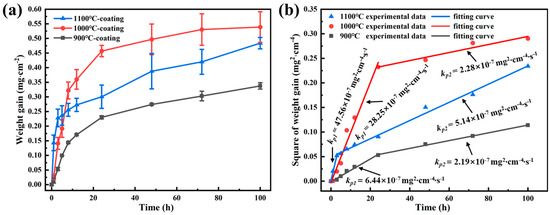 Figure 6a shows the mass gain of the coating as a function of oxidation time at 900–1100 °C. The mass gain is defined as the difference between the mass of the sample at each specific oxidation time point and the initial mass. It can be seen that the oxidation mass gain curves of the coatings at different temperatures are all nearly parabolic [25]. The mass gain of the coating at 900 °C is the lowest among three temperatures throughout the whole 100 h. In the aspect of mass gain at 1000 and 1100 °C, the oxidation mass gain of the coating at 1100 °C is larger than that at 1000 °C before 5 h. However, the mass gain rate at 1100 °C has slowed down significantly after 5 h, resulting in s lower mass gain compared to that at 1000 °C.