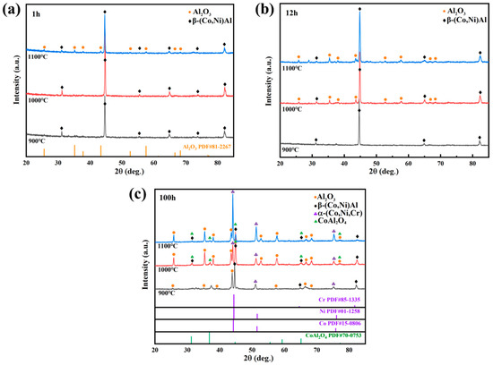 The XRD patterns of the coating after oxidation at 900, 1000, and 1100 °C for 1, 12, and 100 h are shown in Figure 9. It can be seen that the oxidation product of the coating at different temperatures is mainly Al2O3, some minor oxides like CoAl2O4 can also be detected after oxidation for 100 h at 1000 and 1100 °C. However, the onset of Al2O3 formation varies with temperature, with higher oxidation temperatures leading to its earlier and more abundant formation. With the increase in oxidation temperature and oxidation time, the intensity of the diffraction peak of Al2O3 is higher, which indicates that the Al2O3 scale is thicker. The diffraction peaks of α-(Co,Ni,Cr) (abbreviated as α in the following paragraph) appear after oxidation for 100 h at 900, 1000, and 1100 °C.