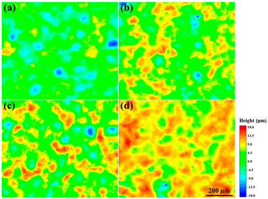 The height profiles of the surface before and after oxidization at 900–1100 °C for 1 h are shown in Figure 12. It can be seen that the coating has a relatively uniform surface with a small surface height variation before oxidation. After oxidation, the height of some areas of the surface increases due to the oxide generation on the coating surface. As the oxidation temperature increases, the surface of the coating becomes more and more uniform. This is due to the transformation of the coating from local oxidation to uniform oxidation [30].