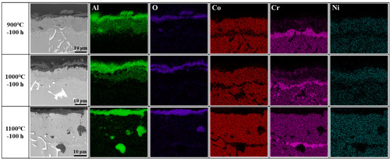 Figure 11 shows the elemental distribution maps of the coating surface after oxidation at 900–1100 °C for 100 h. It can be found that the element distributions on coating surface after oxidation at 900 °C for 100 h were relatively uniform with enrichment of Al and O on the surface. With oxidation temperature increasing to 1000 °C, the main elements on the surface were still Al and O. But, the enrichment of Co, Cr, and Ni in the oxide scale spallation areas could also be observed. The element distributions after oxidation at 1100 °C were similar with those at 1000 °C. But, the oxide scale spallation areas were larger compared to that at 1000 °C, resulting in a larger area of Co, Cr, and Ni enrichment.