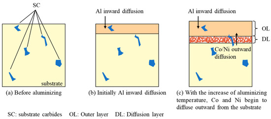 There are two ways to grow aluminide coatings [35]: inward growth and outward growth. The aluminide coating prepared in this study exhibited an inward growth pattern. Figure 16 shows the schematic drawing of the mechanism of the coating formation. During the initial growth of the coating, Al diffuses from the surface of the substrate to the interior first because Al diffuses faster than Co and Ni in (Co,Ni)Al [9,36]. So, the carbides of the substrate will remain in the coating [37], as shown in Figure 3a. With the increase in the aluminizing temperature, the diffusion rate of Co and Ni increases [38,39], and Co and Ni diffuse from the substrate interior to the surface. Therefore, the content of Co and Ni decreases, and the content of Al increases in the region of the substrate near the coating, forming a diffusion zone. Due to the low solubility of Cr in the β phase, it precipitates in the diffusion layer in the form of precipitated phase [9]. As shown in Figure 4a, the surface morphology of the coating appears relatively rough. This is because, during the vapor phase aluminizing process, carbides in the substrate act as localized barriers, disrupting the uniform diffusion of Al, Co, and Ni, which also affects the growth of aluminides. The uneven growth of aluminides results in the rough surface morphology of the coating [40].