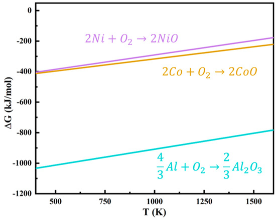Figure 18 illustrates the Gibbs free energy of Al2O3, CoO, and NiO at different temperatures. It can be found that at the same temperature, Al2O3 has the smallest Gibbs free energy, followed by CoO, and the largest is NiO. Spinel CoAl2O4 were formed after oxidation of the coating at 1000 and 1100 °C for 100 h, as illustrated in Figure 9c. This is because the Gibbs free energy from the generation of CoO is lower than that of NiO, and the growth rate of CoO is greater than that of NiO [50], so Co is easily oxidized and forms CoO. CoO reacts with Al2O3 to produce CoAl2O4, as shown in the following expression [51]: