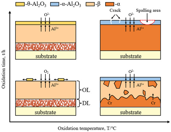 From the above results, it can be seen that the oxidation resistance of the coating is related to the type of Al2O3 formed, interfacial reaction, diffusion reaction, dissolution of the diffusion layer, transformation of phases, and spalling of the oxide layer as illustrated in Figure 19.
