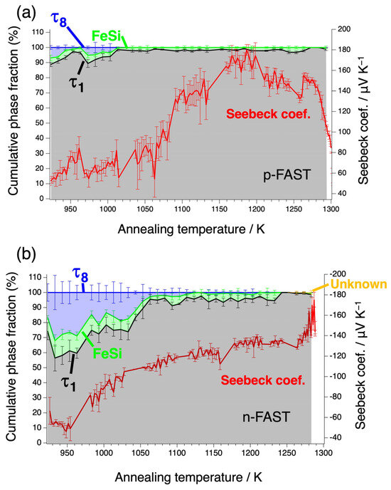 Microstructures after the heat treatment are shown for various heat treatment temperatures in Figure 2b–i,k–r. The chemical compositions of phases observed in the microstructures at respective temperatures are shown in Figure S1 together with the phase diagram [6]. Three-phase microstructures consisting of τ1, τ8, and FeSi are observed at temperatures up to 1033 K in both the p- and n-type samples, while the volume fraction of the τ8 phase decreases with increasing temperature. Above 1033 K, microstructures are composed of the τ1 and FeSi phases with a decreasing trend in the FeSi phase fraction. In addition, there are precipitates at grain boundaries at 1273 K in the n-FAST sample, while this phase has not been identified. The phase fractions were evaluated using X-ray intensity maps for each element obtained by EPMA; results of analysis from the n-type sample at 993 K are shown as examples in Figure 3. Since the samples were prepared by sintering, significant fractions of voids were observed. The phase fractions were evaluated within solid regions. The cumulative phase fractions and Seebeck coefficients are shown in Figure 4. Absolute values of the Seebeck coefficients of both p- and n-types increase up to around 1173 K. As the spatial resolution of the Seebeck coefficient measurements is ~150 µm, which is larger than the length scale of the phase variation shown in Figure 2, each Seebeck coefficient at a single measured point represents the average values of multiple phases shown in Figure 2. At each distance from the top cap of the furnace, measurements were done for five different points and the five values were averaged. The standard deviations of five measured values were used to show the range of error in Figure 4. The trend of absolute values of the Seebeck coefficients is accompanied by the increase in the τ1 fraction and the decrease in the τ8 fraction, and is reasonable because the τ8 phase shows metallic behavior and hence is expected to exhibit a low Seebeck coefficient while the τ1 is known for its excellent thermoelectric properties arising from the formation of a narrow gap near the Fermi level according to first principle calculations [8]. Such variations of the phase fractions can be attributed to atomic diffusion; diffusion distance due to the 24 h annealing is not large enough at low temperatures up to 1173 K compared to the size scales showing inhomogeneity in the as-sintered state shown in Figure 2, while it is large enough to homogenize the samples and achieve the equilibrium compositions of phases at 1173 K and above. Actually, the compositions measured from respective phases are consistent with the reported phase diagram, as shown in Figure 5 for 1173 K [14].