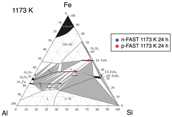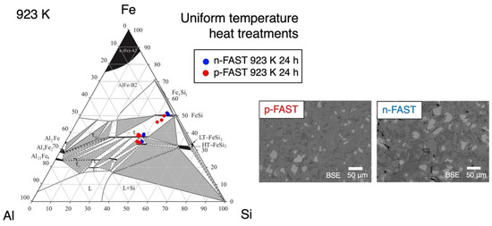 Recently, a new thermoelectric material, “FAST materials” (Fe-Al-Si Thermoelectric materials), has been developed [4,5]. It is a ubiquitous material based on the τ1–Al2Fe3Si3 single phase [6]. The τ1 phase has such a wide compositional range that allows variation in the Al and Si concentrations, xAl = 21.0–41.5 at.% and xSi = 41.5–21.0 at.%, with a limited range of the Fe concentration (xFe: 37.5–38.5 at.%) [6]. One can control the carrier conduction behavior of FAST materials from p- to n-type depending on the Al/Si ratio [7,8], and the maximum power factor S2σ is ~880 µWm−1K−2 [9]. For its abundance, environmentally friendly characteristics, and excellent thermoelectric properties, FAST is a promising material that would be utilized as autonomous power supplies for IoT devices in an advanced information society [10]. In order to realize such widespread use of this material, optimization of material properties is desired from various points of view, including microstructure control; the heat treatment condition for FAST materials has not been refined.