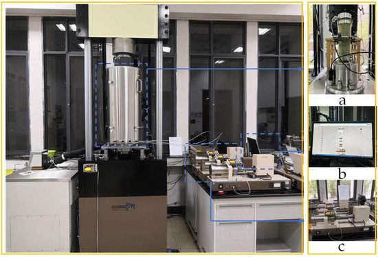 Triaxial test system: (a) rock sample installation; (b) control and monitoring system; (c) pressure control system.