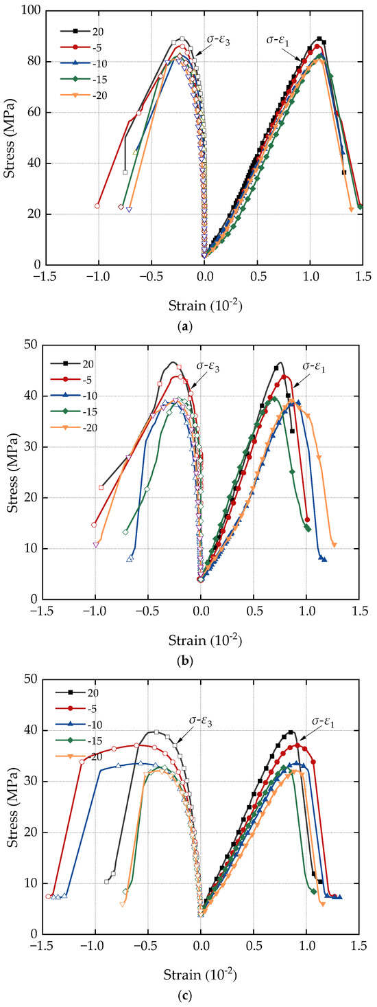 Figure 3 depicts the stress–strain curves of three types of porous sandstone undergoing hydraulic coupling at various negative temperatures following a single freeze–thaw test under triaxial compression. Notably, the peak deviatoric stress for all three types of sandstone decreased, with the attenuation amplitude exhibiting a positive correlation with the porosity of the sandstones under different negative temperature freeze–thaw conditions.