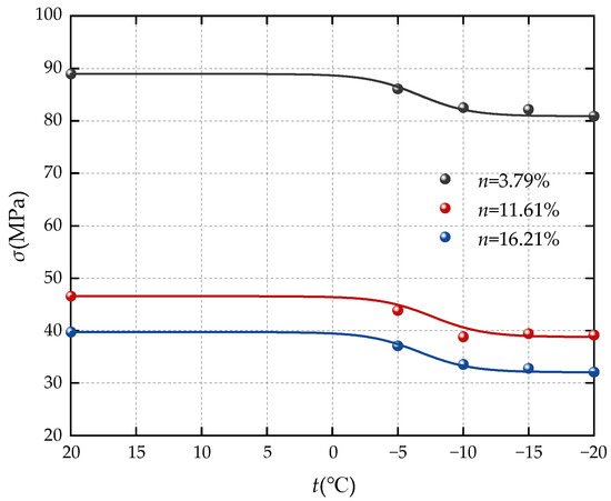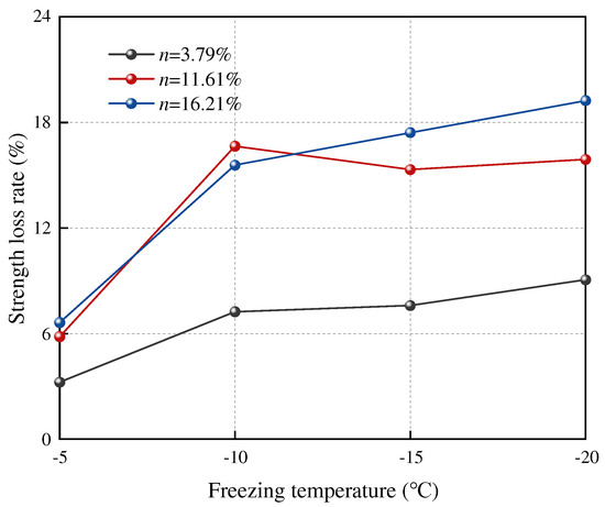 Figure 5 reveal a noticeable increase in the triaxial compressive strength loss rate of sandstone samples as the freezing temperature decreases. In the experimental group with a porosity of n = 3.79%, the triaxial compressive strength loss rate of sandstone rises from 3.23% at −5 °C to 9.06% at −20 °C, reflecting a 5.83% increase. Meanwhile, in the experimental group with a porosity of n = 16.21%, the triaxial compressive strength loss rate of sandstone elevates from 6.63% at −5 °C to 19.24% at −20 °C, indicating a 12.61% increase. These results underscore the significant impact of freezing temperature on the triaxial compressive strength of sandstone, with higher initial porosity leading to a greater strength loss rate. When n = 3.79%, the strength loss rate at −10 °C reaches 79.9% of the maximum loss rate; when n = 11.61%, the strength loss rate at −10 °C reaches 100% of the maximum loss rate; and when n = 16.21%, the strength loss rate at −10 °C reaches 80.9% of the maximum loss rate. Combined with Figure 5, it can be found that the strength loss rate of the sandstone sample changes greatly at −5 °C and −10 °C, and the strength loss rate at −15 °C and −20 °C changes less than that at −10 °C, and the change range of the loss rate is also smaller.