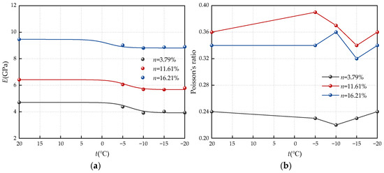 - The overall elastic modulus of sandstone with different porosities decreases with decreasing freezing temperature. The elastic modulus experiences a significant decrease from −5 °C to −10 °C. Below −10 °C, the elastic modulus remains similar to that at −10 °C, showing little change. The relationship between Poisson’s ratio and the freezing temperature for three porosities of sandstone is irregular.
