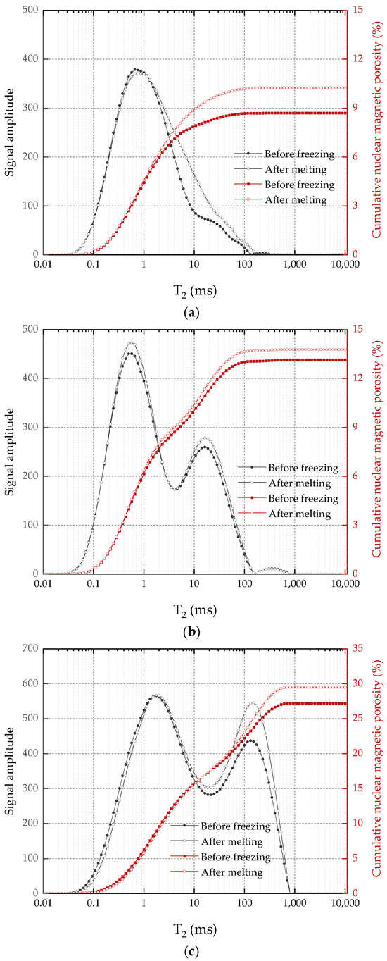 The T2 value corresponds to pore size, and the T2 value distribution reflects information about the pore structure inside the rock sample. Changes in the T2 spectrum of sandstone samples after freezing and thawing indicate the impact of freezing on the evolution of the pore structure. Figure 7a–c depict the T2 spectral distribution curves and cumulative nuclear magnetic porosity of rock samples with three porosity levels before and after freezing, respectively. Observations from the figures include the following: