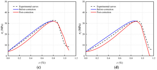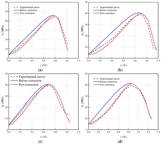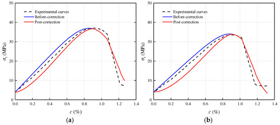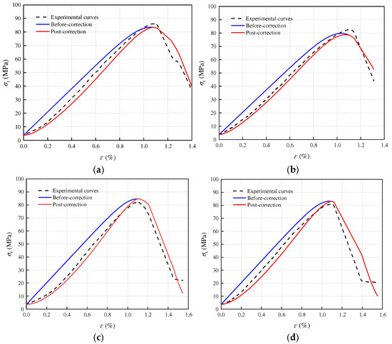 In the early stage of stress loading on rocks, various internal defects such as cracks and pores will compress and close, appearing as concave shapes in the front of the stress–strain curve. Considering the compaction process, the compaction coefficient K [29] is introduced for correction: