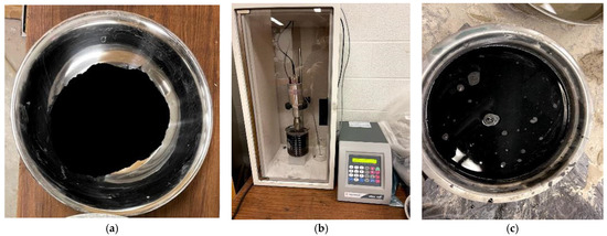 For AAM mixes with the MWCNT and rGO, two-thirds of water and 50% HRWRA were mixed for 1–2 min by hand stirring in the beaker, then MWCNT/rGO was added and hand stirred for 2–3 min. The beaker was then placed inside the sonicator, the probe was inserted in the beaker, and sonication was performed for 30–40 min. The amount of sonication energy was 50 J/mL~75 J/mL to disperse MWCNT/rGO to the water [12,13]. The mixture of sonicated MWCNT/rGO with water and HRWRA was then slowly added into the already made dry mix (as explained previously in control mix preparation) for 4–5 min while mixing continued in the shear mixer followed by the gradual addition of silica sand to prepare MWCNT/RGO-incorporated AAMs. Figure 1 shows the MWCNT before, during, and after sonication and the sonication device. Testing of the fresh state properties was performed immediately after the AAMs were made.