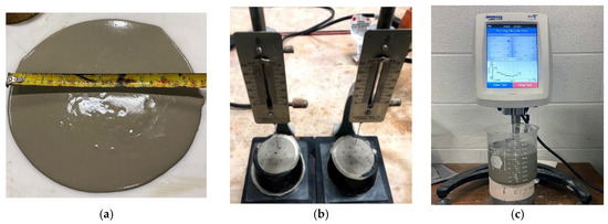 Measurement of (a) slump flow using mini-slump cone, (b) setting times using V-cat apparatus, and (c) rheology using Brookfield DV3T rheometer.