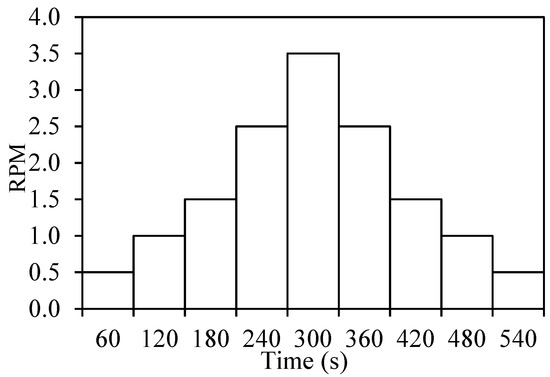 A rheological procedure was defined separately to observe the hysteresis loop and thixotropic behavior for the viscosity of the AAM mixes. The program for the hysteresis loop behavior consisted of two phases for the shear rate in revolutions per minute (RPM)—ramp up and ramp down, as indicated in Figure 3. The RPM was gradually increased from 0.5 RPM to 3.5 RPM and then steadily decreased from 3.5 RPM to 0.5 RPM in the ramp down stage. Each RPM was administered for a period of 60 s using the vane spindle V-73. The thixotropic behavior was assessed by a stepped viscosity program using a V-73 spindle in which viscosity measurements were made for 5 min duration at 0, 30, and 60 min post-mixing with the spindle rotational speed of 3.5 RPM.