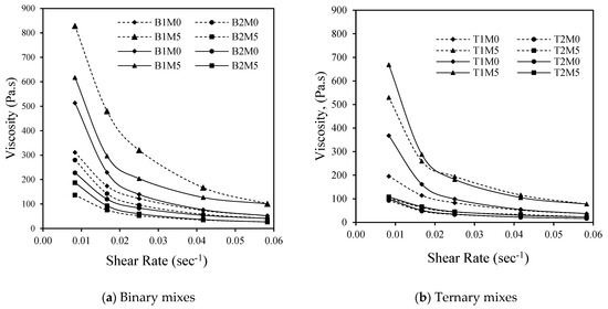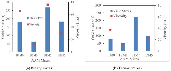 Similarly, in the case of the yield stress values, the binary mixes with 5% MgO exhibited about 2.0–2.5 times higher yield stress values, on average, when compared to their control counterpart with 0% MgO (Figure 4). However, the ternary AAM mixes with 5% MgO showed about 2.5 times higher yield stress values in comparison with the mixes prepared with 0% MgO (T1M0 and T2M0). These high yield stress values for MgO-added AAM mixes can be attributed to more water absorption by MgO, resulting in relatively viscous mixes and, therefore, a higher shear stress value to reach the yielding point. The comparatively lower yield values for the ternary mixes were due to quicker shear deformation at lower stress values resulting from the presence of round-shaped fly ash F within the source material.