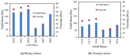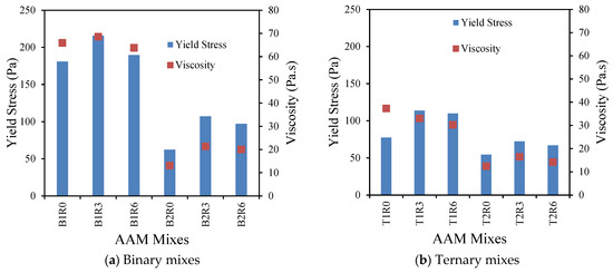 Moreover, it was reported and reasoned that an increase in the silicate content as compared to the alkaline hydroxide contributes towards high viscosity and high yield stress values up to a certain point. This is when the rheological behavior of an FA-based geopolymer/AA system changes from Newtonian to a non-Newtonian one [4,22]. This factor can arguably affect the AAM mixes with reagent type 1, in general, (which contain higher silica, as shown in Table 2 and Table 3) to give a higher viscosity. As the binary mixes and AAM mixes with reagent type 1 appear to be more viscous, a higher shear stress will be required to break the particles and reach the failure limit. Thus, it can be referred to as the reason for the high yield stress values for the binary AAM mixes and AAM mixes with reagent type 1. Introduction of the FA-F as the source material for the ternary mixes can be considered for situations with improved workability.
