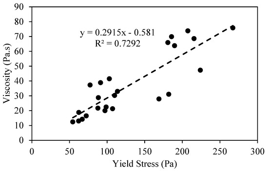 Figure 7 shows a linear correlation between the plastic viscosity and the yield stress values of the AAM mixes. The viscosity increases with the increase in the yield stress as per Equation (1):
