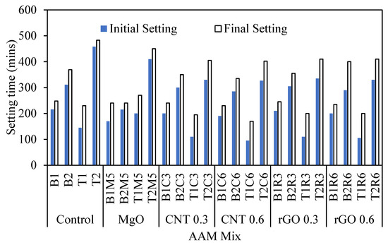 Table 3 summarizes and Figure 8 displays the effect of MgO, MWCNT, and rGO on the initial and final setting times of the AAM mixes. It is evident that the addition of MgO and MWCNT yields comparatively lower initial and final setting times compared to their control counterparts. The initial setting of the reagent 1 mixes decreased from 216 min to 190 min, while for the reagent 2 mixes, it decreased from 311 min to 285 min as the MWCNT dosages increased from 0% to 0.6%. The final setting of the reagent 1 mixes decreased from 248 min to 230 min, while for the reagent 2 mixes, it decreased from 369 min to 335 min as the MWCNT dosages increased from 0% to 0.6% (Table 3). Both the MgO and functionalized MWCNT have high water affinity due to an increased surface area. Therefore, a significant quantity of water becomes absorbed within the surface of this material, resulting in a more viscous matrix (as can be seen from the lower mini-slump values with the addition of MgO and MWNCT in Table 3) and, thus, producing lower setting times. However, for mixes with rGO, the variations in the setting times were insignificant as compared to the control mixes, owing to the probable cause of less water affinity of rGO particles ensuring higher workability with low viscosity causing a lower variation in the setting times. However, accelerated hydration of the geopolymer binder by nanoparticles [74,75] can be considered as a reason for the somewhat lesser workability of AAMs with rGO as compared to the control ones.