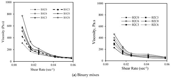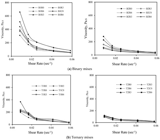 In general, a more rapid decrease in the viscosity was observed for mixes with reagent 1 till 0.02/s (1 RPM), probably due to the higher dissolution potential of sodium metasilicate, leading to the faster release of water during the initial periods of alkali activation. All mixes showed decreased viscosity with an increase in the shear rate, showing pseudoplastic behavior. A similar trend was noted in a previous study where the two-part fly ash-based binders exhibited similar flow curves in both directions (shear ramp up and ramp down) [76]. This reflects that these AAMs are not influenced by the de-clustering of flocci, which is a typical phenomenon in cement-based materials [76].
