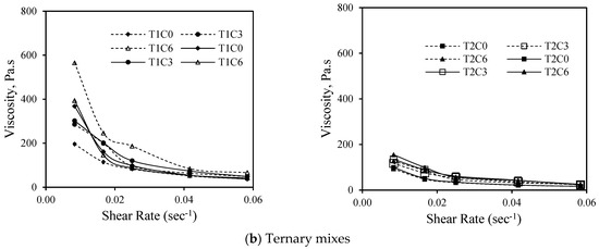 As for the mixes with the MWCNT (Figure 10) and rGO (Figure 11), a similar trend of change in the viscosity was observed with the increasing shear rate identifying these mixes as well as shear-thinning ones. Despite having a high agglomeration tendency for the MWCNT and rGO, under a high shear rate, the re-agglomeration of these particles will have less to no effect on the viscosity of the developed geopolymer/AA mix systems. Moreover, trends of higher viscosity values were observed for the AAM mixes with reagent type 1, 5% MgO, and MWCNT.