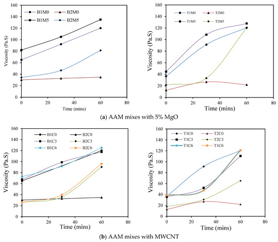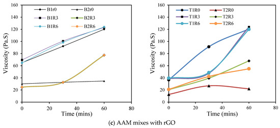 The thixotropic behavior of the developed AAM mixes was assessed by subjecting them to a constant shear rate for 0 min, 30 min, and 60 min. Figure 12a–c are a graphical representation of the viscosity evolution over time. In the case of all the AAM mixes prepared with MgO, the viscosity values increased with an increase in the time. For mixes with reagent type 1, the increase was more prominent but at a steady rate, whereas those with reagent type 2, the increase was sharp from 30 min to 60 min but exhibiting lower viscosity values than ones with reagent type 1. This behavior can be classified as “rheopectic” behavior where the viscosity increases with the time. However, for B2M0 and T2M0, the viscosity was observed to be almost the same or somewhat less for an increase in time from 30 min to 60 min. As for the mixes with the MWCNT and rGO, a similar trend of an increase in the viscosity was observed as the time increased from 0 min to 30 min and then 30 min to 60 min, depicting similar “rheopectic” behavior.